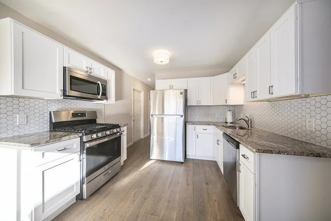 The updated kitchen is a showstopper, featuring white cabinets, premium granite countertops, an undermount sink, stainless steel appliances, a stylish tile backsplash, and a cozy breakfast nook.